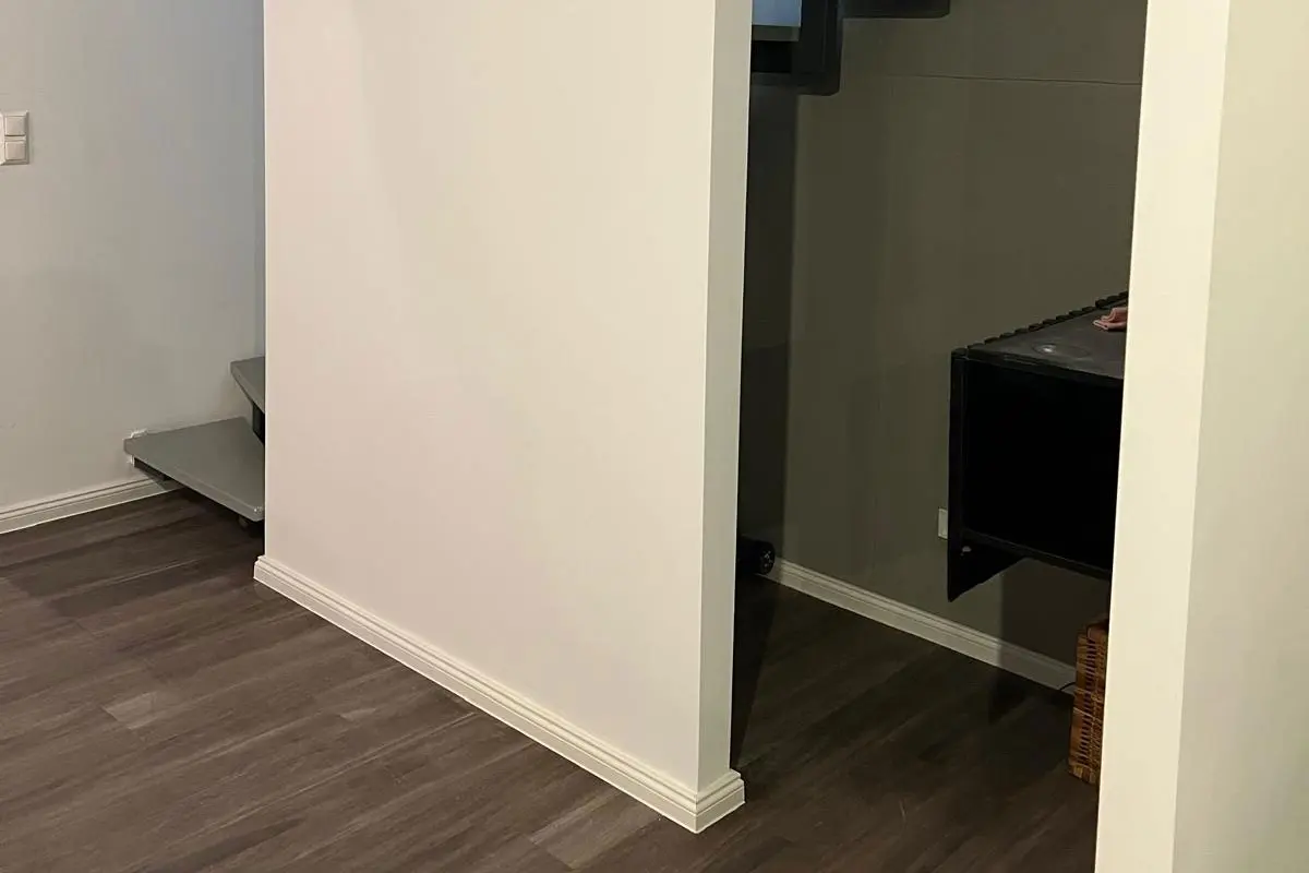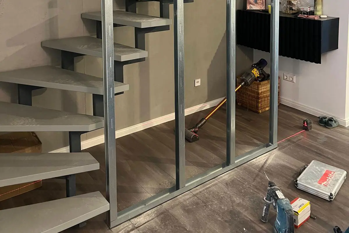 Nach einer sorgfältigen Prüfung der baulichen Gegebenheiten wurde die Trockenbauwand als standsichere Konstruktion geplant und ausgeführt. Die Unterkonstruktion aus Metallprofilen wurde fachgerecht im Boden-, Wand- und Deckenbereich befestigt – gemäß DIN 18182.